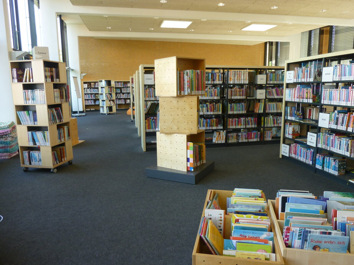 Die Kinder- und Jugendbücher, Bilderbücher und Hörbücher sowie DVDs für Kinder und Erwachsene bilden dabei einen Angebotsschwerpunkt. Fast 10.000 Kinder- und Jugendbücher, 3000 3900 Romane, 18 Zeitschriftenabos und 1 Tageszeitung, DVDs für Erwachsene und Kinder, 5000 5600 Sachbücher zu relevanten und aktuellen Themen, sowie rund 150 Spiele für alle Altersgruppen ergänzen das Angebot. Seit 2014 stehen dem Benutzer auch E-Books aus dem Bereich der Belletristik zur Verfügung.
